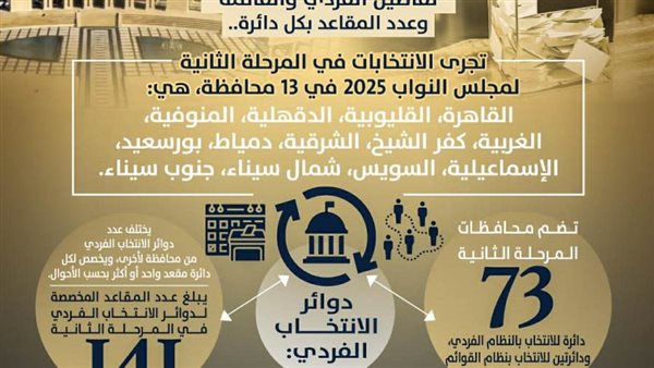 وتجرى الانتخابات في المرحلة الثانية لمجلس النواب ٢٠٢٥ في ١٣ محافظة، هي: القاهرة، القليوبية، الدقهلية، المنوفية، الغربية، كفر الشيخ، الشرقية، دمياط، بورسعيد، الإسماعيلية، السويس، شمال سيناء، جنوب سيناء، وتضم محافظات المرحلة الثانية ٧٣ دائرة للانتخاب بالنظام الفردي، ودائرتين للانتخاب بنظام القوائم المغلقة المطلقة.