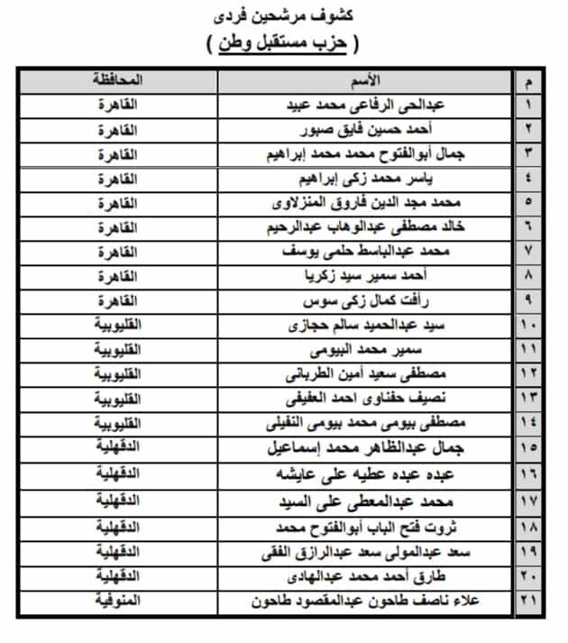 بالأسماء ..مستقبل وطن يخوض انتخابات الشيوخ علي 93%من المقاعد الفردية