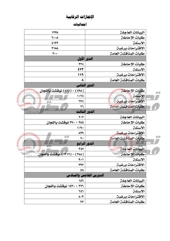 وفيما يتعلق بالدور الرقابي، بلغ عدد البيانات العاجلة 1278، وطلبات الإحاطة 6008، والاسئلة 4133، والاقتراحات برغبة 3188، وطلبات المناقشة العامة 200.